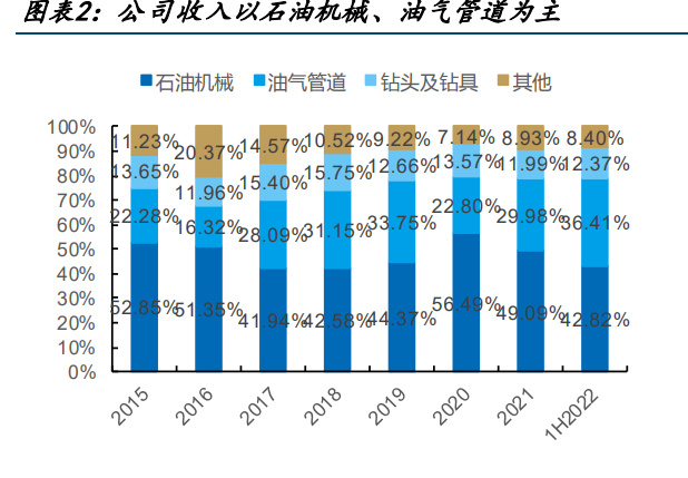 公司收入以石油機(jī)械、油氣管道為主,石油機(jī)械貢獻(xiàn)主要毛利。1H22 公司石油機(jī)械與油 氣管道貢獻(xiàn) 79.23%收入,油氣管道毛利率較低,毛利主要由石油機(jī)械貢獻(xiàn)。