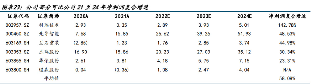從部分有Wind一致預(yù)期的公司看,21至24年凈利潤復(fù)合增速5家企業(yè)平均值為54.85%, 其中蘭石重裝、先導(dǎo)智能預(yù)計復(fù)合增速分別約為 45%、49%,科瑞技術(shù)高達(dá) 143%,考慮其 余企業(yè)中仍有企業(yè)有望實(shí)現(xiàn)高復(fù)合增速,公司要超過 75 分位值水平(高于第五)預(yù)計凈 利潤復(fù)合增速較高,我們預(yù)計公司 21 至 24 年凈利潤復(fù)合增速為 49.69%。