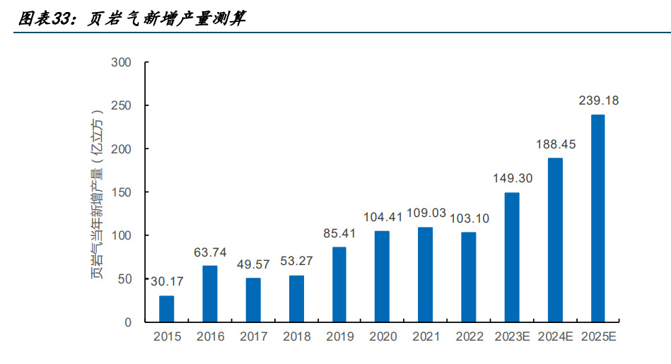 對于頁巖氣產(chǎn)量的遠(yuǎn)期預(yù)測,我們結(jié)合《頁巖氣發(fā)展規(guī)劃 2016-2020》展望的 2030 年實(shí) 現(xiàn)頁巖氣產(chǎn)量 800 至 1000 億立方,與中國頁巖氣當(dāng)前勘探開發(fā)、技術(shù)進(jìn)步、設(shè)備總體形 式預(yù)測,預(yù)計 25 年頁巖氣產(chǎn)量有望占到天然氣產(chǎn)量的 15%,即頁巖氣產(chǎn)量在 25 年達(dá)到 460 億方,22 至 25 年 CAGR22.62%。
