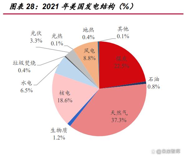 核電發(fā)電量占比穩(wěn)定。在美國發(fā)電結(jié)構(gòu)中,1990年以來核電一直維持在20% 左右水平。天然氣發(fā)電成本相對較低,21 世紀頁巖氣革命再度夯實天然氣 成本優(yōu)勢,天然氣發(fā)電比例快速增長。近年來天然氣價格波動明顯,以及電 源清潔型的重視程度提升,光伏風電成本的快速下降,其占比逐漸提升。