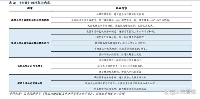 在 2022 年,《國企改革三年行動(dòng)方案》的收官之年,國資委提出了《提高央企控股上市公 司質(zhì)量工作方案》(下稱《方案》),這開啟了新一輪的央企改革?!斗桨浮访鞔_了提高央 企上市公司質(zhì)量的指導(dǎo)思想和整體思路,要求中央企業(yè)要做好三個(gè)方面的統(tǒng)籌平衡,即堅(jiān)持 做優(yōu)存量與做精增量結(jié)合;堅(jiān)持價(jià)值創(chuàng)造與價(jià)值實(shí)現(xiàn)兼顧;堅(jiān)持依法合規(guī)與改革創(chuàng)新并重。 《方案》從推動(dòng)上市平臺布局優(yōu)化和功能發(fā)揮、促進(jìn)上市公司完善治理和規(guī)范運(yùn)作、強(qiáng)化上 市公司內(nèi)生增長和創(chuàng)新發(fā)展、增進(jìn)上市公司市場認(rèn)同和價(jià)值實(shí)現(xiàn)等四個(gè)實(shí)施方面,提出 14 項(xiàng)具體工作舉措。