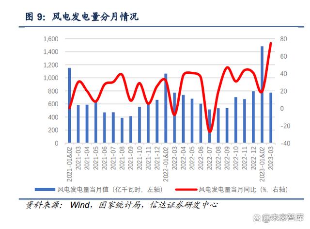 結(jié)構(gòu)方面,2023Q1 第一產(chǎn)業(yè)用電量同比增長 9.7%,第二產(chǎn)業(yè)用電量同比增長 4.2%,第三產(chǎn)業(yè)用電量同比增長 4.1%,而城鄉(xiāng)居民生活用電量同比增長僅 0.2%(一二三產(chǎn)及居民 生活用電占全社會用電量的比重分別為 1.25%、65.17%、17.43%、16.15%),居民生活 用電的低增長拖累一季度整體用電量的增速。從電力消費彈性系數(shù)來看,2022 年度全社會 用電量增速為 3.6%,GDP 增速為 3%,電力消費彈性系數(shù)達到 1.2;然而受居民生活用電 2023Q1 增速大幅放緩的影響,2023Q1 我國在實現(xiàn) 4.5%的 GDP 增速同時,用電量增速僅 3.6%,電力消費彈性系數(shù)下降至 0.8。 其中,1-2月一、二、三產(chǎn)業(yè)和城鄉(xiāng)居民生活用電量分別同比變化6.64%、3.48%、-0.11%、 2.75%,而 3 月單月的一、二、三產(chǎn)業(yè)和城鄉(xiāng)居民生活用電量分別同比變化 18.65%、 6.67%、14.04%、-5.76%。3 月以來開工復(fù)蘇潮表現(xiàn)明顯,二產(chǎn)用電增速穩(wěn)中向好,三產(chǎn) 用電增速大幅反彈,但 3 月份居民生活用電同比下降 5.76%,相較于去年同期(2022 年 3 月)高達 8.92%的居民生活用電增速,降幅高達 14.68pct。暖冬對于居民生活用電影響較 大,2 月下旬至 3 月上旬,我國中東部地區(qū)氣溫明顯升高,相比常年同期偏暖。