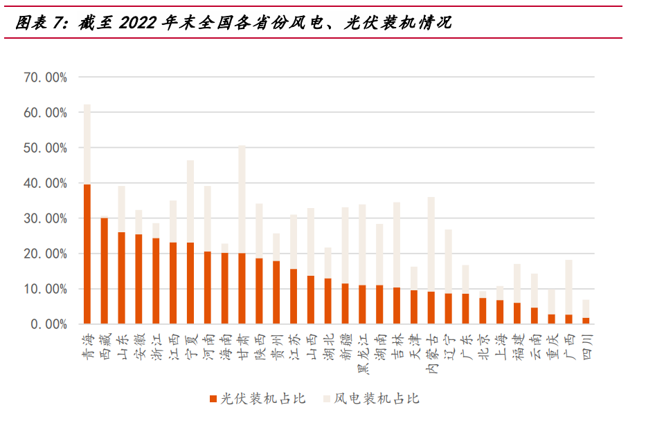 截至 2022 年末,全國(guó)各省風(fēng)電、光伏裝機(jī)量占各省總裝機(jī)量比例前五名的為青 海、西藏、河北、寧夏、安徽(按光伏裝機(jī)排序);全國(guó)各省風(fēng)電、光伏發(fā)電量占各 省總發(fā)電量比例前五名的為青海、西藏、寧夏、甘肅、山東。 考慮到新能源滲透率與分時(shí)電價(jià)特征高度相關(guān),因此全國(guó)多個(gè)省份均可出現(xiàn)類似 山東省的電價(jià)分時(shí)特征,如青海、寧夏、甘肅等。