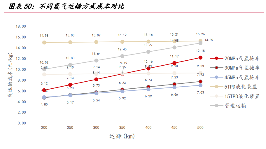 氣氫拖車是目前國內(nèi)最成熟的氫氣運輸形式,我國氫氣管束式集裝箱和氫氣長管 拖車大多采用鋼制大容積無縫高壓氣瓶和鋼制內(nèi)膽碳纖維環(huán)向纏繞氣瓶,工作壓力通 常為 20Mpa,單次運輸氫氣質(zhì)量小,運輸效率低,適用于 200 公里以內(nèi)的短距離運輸。 綜合市場上管束式氫氣集裝箱的平均輸氫量,假設(shè) 20/30/45MPa 管束式集裝箱最大可 運輸氫氣質(zhì)量 340/650/950 千克,管束式集裝箱費用 60/70/80 萬,單位壓縮電耗 2/4.5/6kWh/kg,則運距 500 公里的運輸成本高達 7 元/kg 以上。
