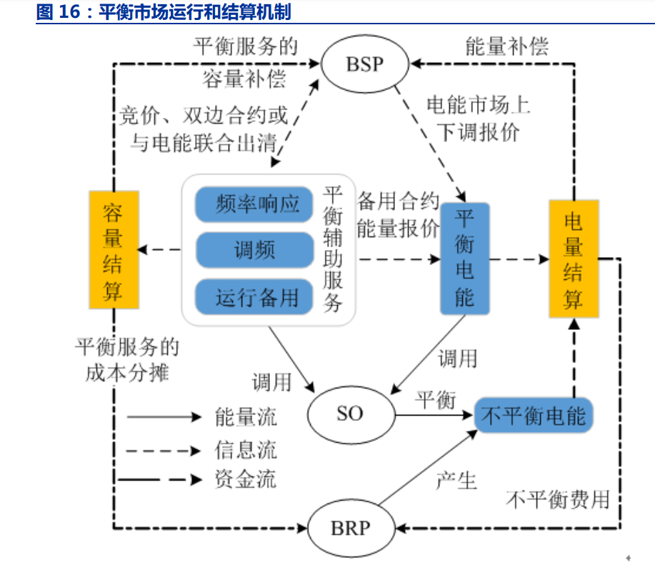 歐洲的平衡市場源于 2017 年 12 月 23 日歐盟委員會 EB 條例,該條例給出一個指導(dǎo) 方針,使得各國可以在平衡市場中共享資源,從而使發(fā)電量始終與用電量相等。從實際達 成的效果來看,歐洲平衡市場與我國的調(diào)頻輔助服務(wù)類似。 在平衡市場中,調(diào)度智能歸于 TSO 或者 DSO,參與平衡市場運行和結(jié)算的市場成員 包括 BSP(BalanceServiceProvider,BSP)和 BRP(BalanceResponsibilityParty,BRP) 等。其中 BSP 提供平衡資源,在實際運行中根據(jù)系統(tǒng)頻率變化或調(diào)度指令改變自身出力以 幫助系統(tǒng)恢復(fù)平衡,BRP 是承擔責任并參與不平衡結(jié)算的市場成員。