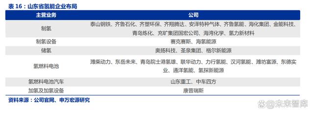 山東依靠扎實(shí)的氫能產(chǎn)業(yè)鏈落實(shí)“氫進(jìn)萬(wàn)家”政策,未來(lái)氫能發(fā)展將與燃料電池示范城市群平行。山東省企業(yè)布局: