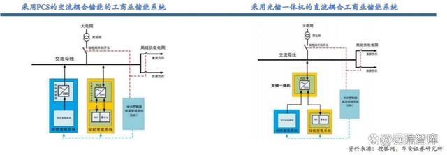 商業(yè)儲(chǔ)能系統(tǒng)架構(gòu)主要有兩種:1)采用 PCS 的交流耦合型;2)采用光儲(chǔ)一體機(jī)的直流耦合型。交流耦合系統(tǒng)與儲(chǔ)能電站的系統(tǒng)配置類似,但相對(duì)用量較小,系統(tǒng)功能也更為簡(jiǎn)單,其中的光伏系統(tǒng)和儲(chǔ)能系統(tǒng)并聯(lián),靈活性較高,適用于已安裝工商業(yè)光伏的存量市場(chǎng)。直流耦合系統(tǒng)通過光儲(chǔ)一體機(jī)將光伏逆變器和雙向變流器整合在一起,相比交流耦合系統(tǒng)具有高度集成化、軟性成本低的特點(diǎn),50-100kW 的光儲(chǔ)一體機(jī)已逐漸成為中小工商業(yè)儲(chǔ)能系統(tǒng)的選擇。