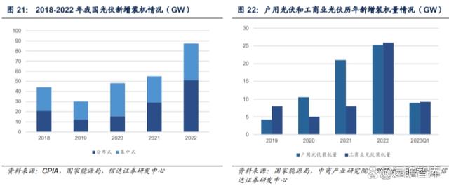 工商業(yè)光伏裝機(jī)量趕超戶用光伏裝機(jī)量,發(fā)展駛?cè)肟燔?chē)道,2022 年工商業(yè)光伏新增裝機(jī)量同比增長(zhǎng)236%,2021 年 6 月國(guó)家能源局指出 2023 年底,工商業(yè)廠房屋頂總面積可安裝光伏發(fā)電比例不低于30%。展望今年,工商業(yè)光伏有望延續(xù)蓬勃發(fā)展態(tài)勢(shì)。