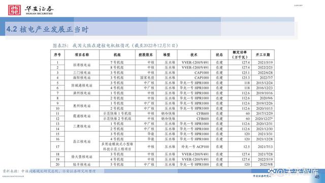 2016~2020年,美國(guó)西屋的AP1000和法國(guó)電力集團(tuán)的 EPR三代核電技術(shù)全球首堆先后在我國(guó)成功建成投產(chǎn)。 我國(guó)在過(guò)去近40年中,成為全球唯一一個(gè)從沒(méi)有中斷核 電項(xiàng)目建設(shè)的國(guó)家,且掌握了建造世界主流核電機(jī)型的 能力,施工能力卓越,對(duì)于核電項(xiàng)目的建設(shè)有先進(jìn)管理 理念和豐富的經(jīng)驗(yàn),對(duì)核電工期具備強(qiáng)有力的掌控能力。