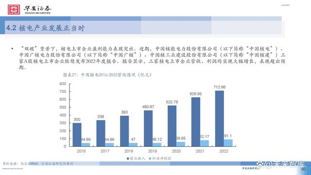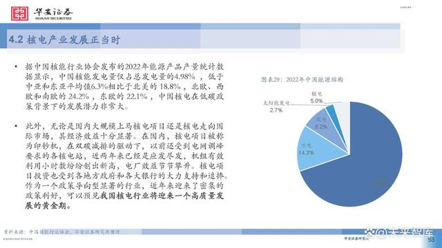 據(jù)中國(guó)核能行業(yè)協(xié)會(huì)發(fā)布的2022年能源產(chǎn)品產(chǎn)量統(tǒng)計(jì)數(shù) 據(jù)顯示,中國(guó)核能發(fā)電量?jī)H占總發(fā)電量的4.98% ,低于 中亞和東亞平均值6.3%相比于北美的 18.8% ,北歐、西 歐和南歐的 24.2% ,東歐的 22.1% ,中國(guó)核電在低碳政 策背景下的發(fā)展?jié)摿Ψ浅4蟆?此外,無(wú)論是國(guó)內(nèi)大規(guī)模上馬核電項(xiàng)目還是核電走向國(guó) 際市場(chǎng),其經(jīng)濟(jì)效益十分顯著。在國(guó)內(nèi),核電項(xiàng)目被稱(chēng) 為印鈔機(jī),在雙碳減排的驅(qū)動(dòng)下,以前還受到電網(wǎng)調(diào)峰 要求的各核電站,近兩年來(lái)已經(jīng)是應(yīng)發(fā)盡發(fā),機(jī)組有效 利用小時(shí)數(shù)紛紛創(chuàng)出新高,電廠效益節(jié)節(jié)攀升。核電項(xiàng) 目投資也受到各地方政府和各大銀行的大力支持和追捧。 作為一個(gè)政策導(dǎo)向型顯著的行業(yè),近年來(lái)迎來(lái)了密集的 政策利好,可以預(yù)見(jiàn)我國(guó)核電行業(yè)將迎來(lái)一個(gè)高質(zhì)量發(fā) 展的黃金期。