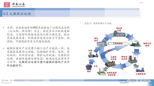 目前,全球在運(yùn)營(yíng)的400多座核電廠以輕水反應(yīng)堆 (壓水堆、沸水堆)為主,經(jīng)過(guò)多年不斷改進(jìn)和 完善,大型輕水堆核電技術(shù)已經(jīng)日趨完善,但從 長(zhǎng)遠(yuǎn)發(fā)展來(lái)看,仍然面臨著安全性與可靠性、經(jīng) 濟(jì)性、可持續(xù)性等重大問(wèn)題的挑戰(zhàn)。 核燃料循環(huán)產(chǎn)業(yè)是整個(gè)核工業(yè)產(chǎn)業(yè)鏈的一環(huán),也 是核能發(fā)展的大動(dòng)脈,包括鈾礦開(kāi)采、冶煉、轉(zhuǎn) 化純化、同位素分離、燃料元件制造、乏燃料后 處理、放射性廢物處理處置、核電站反應(yīng)堆等多 個(gè)環(huán)節(jié)。乏燃料后處理為整個(gè)核燃料循環(huán)產(chǎn)業(yè)中 的關(guān)鍵環(huán)節(jié)。