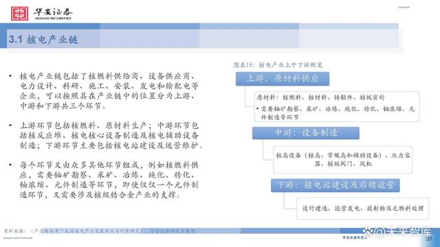 核電產(chǎn)業(yè)鏈包括了核燃料供給商、設(shè)備供應(yīng)商、 電力設(shè)計(jì)、科研、施工、安裝、發(fā)電和輸配電等 企業(yè),可以按照其在產(chǎn)業(yè)鏈中的位置分為上游、 中游和下游共三個(gè)環(huán)節(jié)。 上游環(huán)節(jié)包括核燃料、原材料生產(chǎn);中游環(huán)節(jié)包 括核反應(yīng)堆、核電核心設(shè)備制造及核電輔助設(shè)備 制造;下游環(huán)節(jié)主要包括核電站建設(shè)及運(yùn)營(yíng)維護(hù)。 每個(gè)環(huán)節(jié)又由眾多其他環(huán)節(jié)組成,例如核燃料供 應(yīng),需要鈾礦勘察、采礦、冶煉、純化、轉(zhuǎn)化、 鈾濃縮、元件制造等環(huán)節(jié),即使僅僅一個(gè)元件制 造環(huán)節(jié),又需要涉及核級(jí)鋯合金產(chǎn)業(yè)的支撐。