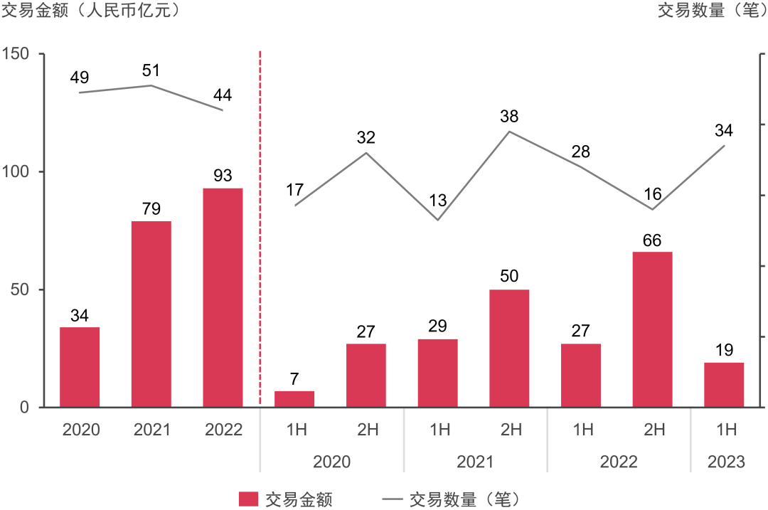 2020年至2023年上半年氫能行業(yè)并購交易金額及交易數(shù)量