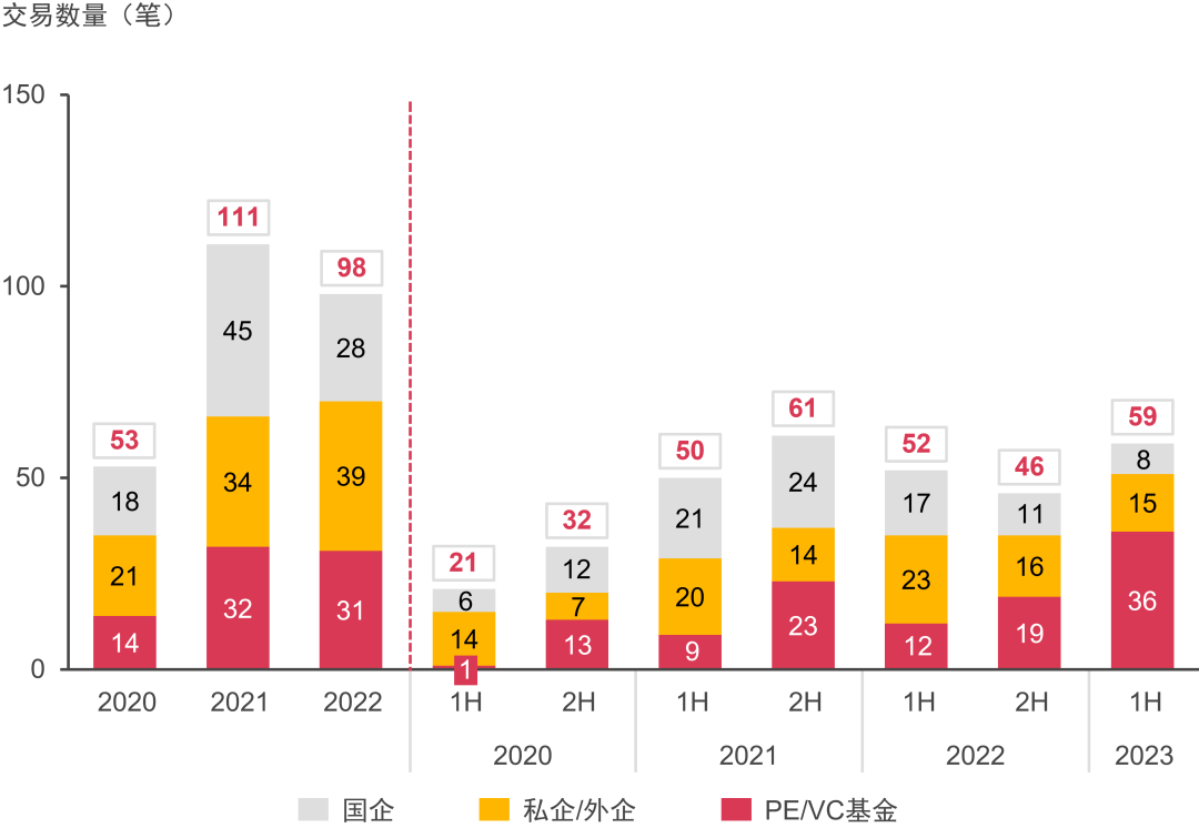 國企整體投資熱度有所下降,上半年僅有兩筆交易;顯示出國企對于行業(yè)成熟度提高后的投資謹慎性。