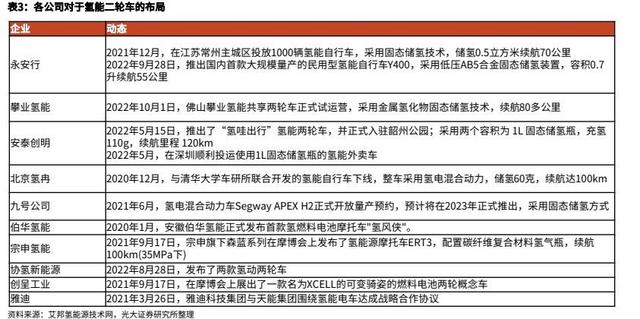 目前氫能二輪車(chē)布局主要來(lái)自于二輪車(chē)企業(yè)向氫能業(yè)務(wù)擴(kuò)展。如永安行2B端推出Y200,2C端針對(duì)歐洲市場(chǎng)推出Y400。雅迪科技集團(tuán)與天能集團(tuán)圍繞氫能達(dá)成合作協(xié)議。