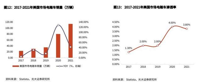 美國(guó)市場(chǎng)起步較晚,客戶(hù)群體主要為運(yùn)動(dòng)愛(ài)好者和極限發(fā)燒友。2020年以來(lái),受疫情催化及政策推動(dòng),更多消費(fèi)者選擇電踏車(chē)以滿(mǎn)足其通勤及休閑需求,客戶(hù)群體進(jìn)一步擴(kuò)大。2021年美國(guó)電踏車(chē)銷(xiāo)量114萬(wàn)輛,同比增長(zhǎng)40.7%,滲透率提升至3.8%。從美國(guó)政府提出的一系列稅收抵免、通勤津貼、關(guān)稅暫緩的政策,以及美國(guó)市場(chǎng)目前較低的滲透率來(lái)看,未來(lái)美國(guó)市場(chǎng)仍具有很大發(fā)展?jié)摿Α?/p>