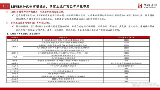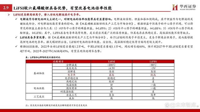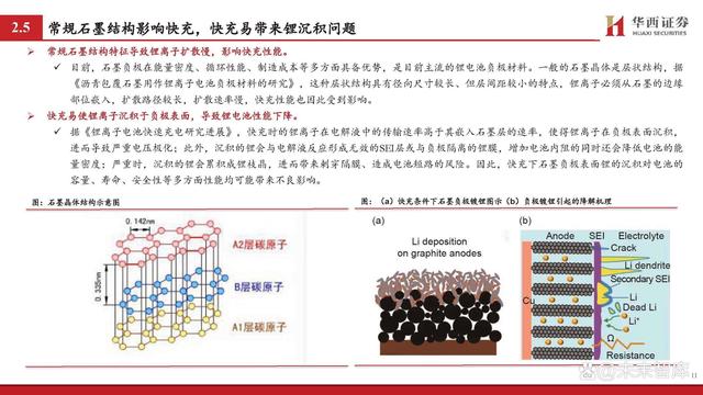鋰離子傳輸是影響快充核心,重點(diǎn)聚焦負(fù)極和電解液等材料。據(jù) 《鋰離子電池快速充電研究進(jìn)展》: 鋰電池也被稱為“搖椅”式電池,鋰離子傳輸是影響充電 過(guò)程的重要因素。在充電過(guò)程中,鋰離子的路徑大致為: 從正極材料中脫出,通過(guò)正極/電解質(zhì)界面(CEI)進(jìn)入電 解液,并以溶劑化的形式移動(dòng)至負(fù)極,在去溶劑化后穿過(guò) 負(fù)極表面的固體/電解質(zhì)界面(SEI)嵌入負(fù)極層狀結(jié)構(gòu)中并 與電子結(jié)合。 對(duì)于電極材料而言,材料內(nèi)部離子傳輸通道及材料顆粒的 形態(tài)、形狀和取向等是影響鋰離子的擴(kuò)散的重要因素,其 中負(fù)極相較正極受影響更大。對(duì)于電解液而言,由于傳統(tǒng) 的電解液在氧化還原穩(wěn)定性上具備劣勢(shì),快充會(huì)使其不斷 分解并形成EEI層,導(dǎo)致鋰離子呈現(xiàn)較慢的傳輸動(dòng)力學(xué);同 時(shí),傳統(tǒng)電解液的溶劑化結(jié)構(gòu)去溶劑化勢(shì)壘較高,對(duì)鋰離 子的擴(kuò)散形成阻礙。 因此,如何顯著提升鋰離子在負(fù)極、電解液等材料中的擴(kuò) 散動(dòng)力學(xué)成為當(dāng)下研究的重點(diǎn)。