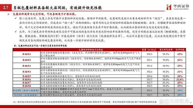 包覆材料通常為無(wú)定形碳,可改善鋰離子擴(kuò)散性能。 除二次造粒外,包覆工序也可提升石墨材料快充性能。據(jù)翔豐華招股書(shū),包覆碳化是指以石墨類碳材料作為“核芯”,在其表面包覆一 層均勻的無(wú)定形碳材料,形成類似“核-殼”結(jié)構(gòu)的顆粒;通常用的無(wú)定形碳材料的前軀體有酚醛樹(shù)脂、瀝青、檸檬酸等低溫?zé)峤馓疾?料,由于無(wú)定形碳材料的層間距比石墨大,因此可改善鋰離子在其中的擴(kuò)散性能,從而提高石墨材料的大電流充放電性能。 此外,為了避免瀝青等材料在碳化過(guò)程中可能出現(xiàn)的各向異性并進(jìn)而影響倍率性能的問(wèn)題,現(xiàn)有專利提出通過(guò)改性劑(酚醛樹(shù)脂、殼聚 糖、聚酰亞胺、聚酰胺或PET等)對(duì)基底材料(瀝青)進(jìn)行改性(高溫?cái)嚢杌旌系?,而后對(duì)石墨進(jìn)行包覆,此后在熱處理過(guò)程中便可 構(gòu)筑具有各向同性的碳包覆層結(jié)構(gòu),從而進(jìn)一步提升材料的快充性能。