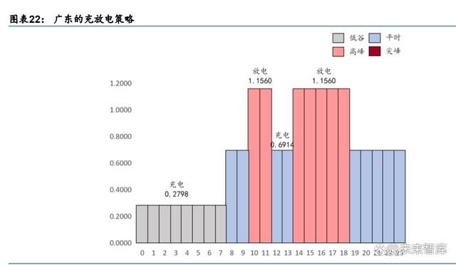 峰谷時段持續(xù)優(yōu)化,多省份滿足兩充兩放。根據(jù)各地區(qū)的分時電價策略,我們梳理出其對 應的峰谷套利策略,超 20 個省份已滿足兩充兩放的充放電策略,浙江、山西、新疆由于午 時為低谷電價,可實現(xiàn) 2 次“谷充峰放”策略,其余多數(shù)省份可采用“谷充峰放+平充峰放” 策略。江蘇、黑龍江、福建、翼北可實現(xiàn)三充三放(2.5 次滿充放)。多省份已經具備較為 優(yōu)越的投資經濟性。