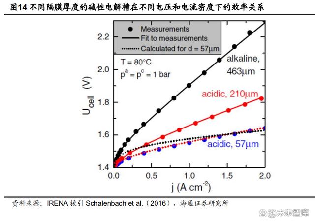 減小隔膜厚度:可以提高效率并減少電力消耗。隔膜越薄,將 OH-從陰極運(yùn)輸 到陽(yáng)極的阻力就越低,但由于氣體滲透水平較高,從而可能導(dǎo)致安全問(wèn)題。另 一個(gè)缺點(diǎn)是耐久性較低,因?yàn)楦裟ぶ懈锌赡軙?huì)形成針孔,導(dǎo)致機(jī)械魯棒性降 低。總體而言,堿性電解槽的隔膜厚度應(yīng)該接近 PEM 槽和 AEM 槽的水平。對(duì) 于 PEM 來(lái)說(shuō),目前最先進(jìn)的膜厚度為 125-175 μm,并有潛力降低到 20 μm。 ALK 目前的隔膜厚度為 460 μm,將其降低到 50 μm 可以使堿槽在 1A/cm2 下 的效率從 53%提升到 75%。