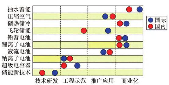 從各類(lèi)儲(chǔ)能技術(shù)的研發(fā)推廣進(jìn)程看,目前我國(guó)儲(chǔ)能技術(shù)基本上與國(guó)際先進(jìn)水平并跑,壓縮空氣儲(chǔ)能、儲(chǔ)熱儲(chǔ)冷、鉛蓄電池、鋰離子電池、液流電池和鈉離子電池技術(shù)已達(dá)到或接近世界先進(jìn)水平;抽水蓄能、飛輪儲(chǔ)能、超級(jí)電容和儲(chǔ)能新技術(shù)與世界先進(jìn)水平還有一定的差距,如下圖所示。