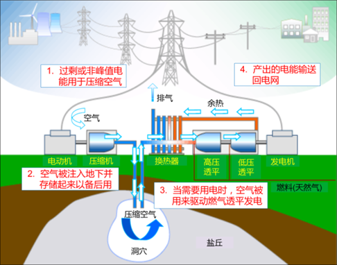 ——工作原理。傳統(tǒng)的壓縮空氣儲(chǔ)能是基于燃?xì)廨啓C(jī)開(kāi)發(fā)的儲(chǔ)能技術(shù),其工作原理是,在用電低谷,用過(guò)剩的電能來(lái)驅(qū)動(dòng)壓縮機(jī),將空氣壓縮至高壓并儲(chǔ)存在儲(chǔ)氣裝置(如地面儲(chǔ)氣罐、地下鹽穴、地下人工硐室等)中,使電能轉(zhuǎn)化為空氣的內(nèi)能存儲(chǔ)起來(lái);在用電高峰,由儲(chǔ)氣裝置釋放儲(chǔ)存的高壓空氣,通過(guò)(進(jìn)入燃燒室)燃燒或者換熱的方式,加熱壓縮氣體,將其輸送至膨脹機(jī)內(nèi)膨脹做功,推動(dòng)發(fā)電機(jī)發(fā)電。其工作原理如下圖所示。