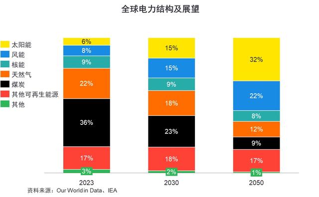 縱觀全球電力結(jié)構(gòu),2023年石油、煤炭和天然氣三大傳統(tǒng)能源仍占主導(dǎo)地位,占比高達(dá)61%,可再生能源占比約為39%,其中太陽能發(fā)電僅占6%。全球電力結(jié)構(gòu)正面臨深刻變革,根據(jù)國際能源署(IEA)預(yù)測,到2030年,傳統(tǒng)能源發(fā)電主導(dǎo)地位受到挑戰(zhàn);到2050年,可再生能源將成為電力結(jié)構(gòu)的主力軍,占比高達(dá)79%,其中太陽能發(fā)電預(yù)計(jì)將達(dá)到32%。