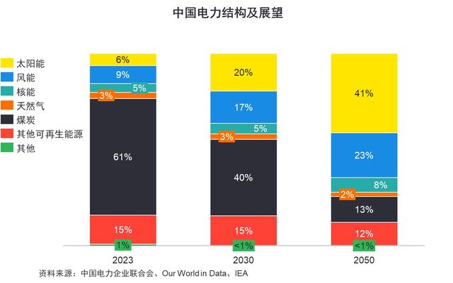 2023年,中國電力供應(yīng)結(jié)構(gòu)中傳統(tǒng)能源發(fā)電占比65%,可再生能源發(fā)電占比35%,其中光伏發(fā)電占比僅6%。據(jù)國際能源署(IEA)預(yù)測,2050年76%的電力供應(yīng)將來自于可再生能源,其中光伏占比為41%。屆時(shí),光伏將成為中國構(gòu)建以新能源為主的新型電力系統(tǒng)的核心力量之一。