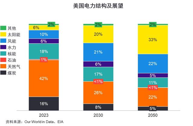 作為以油氣為主的能源大國,2023年美國電力供應(yīng)結(jié)構(gòu)中傳統(tǒng)能源發(fā)電占比59%,新能源發(fā)電占比41%,其中光伏發(fā)電占比僅6%。這距離美國“3550”計(jì)劃[2]中提出的2035年實(shí)現(xiàn)無碳發(fā)電的目標(biāo)還有很大距離。對(duì)美國而言,發(fā)展光伏是其能源結(jié)構(gòu)調(diào)整的重要一環(huán),也是進(jìn)一步穩(wěn)固其能源強(qiáng)國地位的必要手段。據(jù)美國能源署(EIA)預(yù)測,到2030年,66%的電力供應(yīng)將來自于新能源,其中光伏占比提升至20%,到2050年,73%的電力供應(yīng)將來自于新能源,其中光伏占比大幅提升至33%。