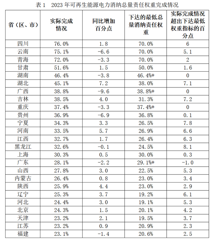 根據(jù)《國家發(fā)展改革委辦公廳 國家能源局綜合司關(guān)于2023年可再生能源電力消納責任權(quán)重及有關(guān)事項的通知》(發(fā)改辦能源〔2023〕569號),綜合考慮各省本地生產(chǎn)、本地利用以及外來電力消納情況,全國各省(自治區(qū)、直轄市)可再生能源電力消納責任權(quán)重總體完成較好,具體完成情況如下。