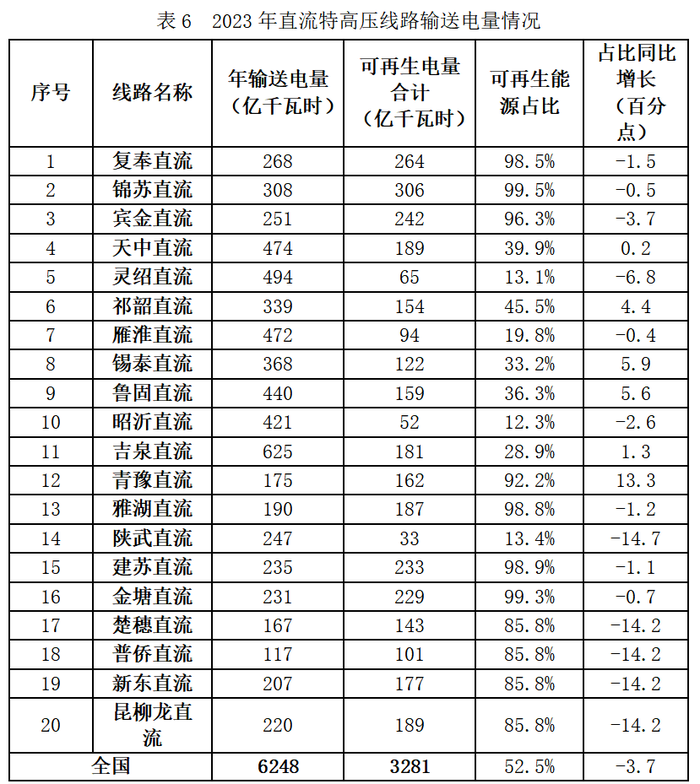 2023年,20條直流特高壓線路年輸送電量6248億千瓦時,其中可再生能源電量3281億千瓦時,同比提高3.6%,可再生能源電量占全部直流特高壓線路總輸送電量的52.5%。國家電網(wǎng)運營的16條直流特高壓線路總輸送電量5537億千瓦時,其中可再生能源電量2672億千瓦時,占總輸送電量的48.3%;南方電網(wǎng)運營的4條直流特高壓線路輸送電量711億千瓦時,其中可再生能源電量610億千瓦時,占總輸送電量的85.8%。