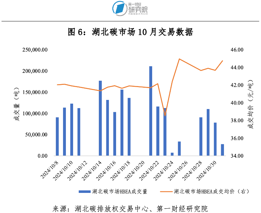 10月湖北碳市場(chǎng)碳排放配額(HBEA)交易成交量193.82萬(wàn)噸,成交額8143.04萬(wàn)元。期間,最高價(jià)45.50元/噸,最低價(jià)38.00元/噸,成交均價(jià)42.01元/噸。10月最后一個(gè)交易日收盤價(jià)44.78元/噸,較9月最后一個(gè)交易日收盤價(jià)42.16元/噸上漲6.21%。截至10月31日,HBEA(不包括遠(yuǎn)期和拍賣)累計(jì)成交量1.34億噸,累計(jì)成交額33.35億元。