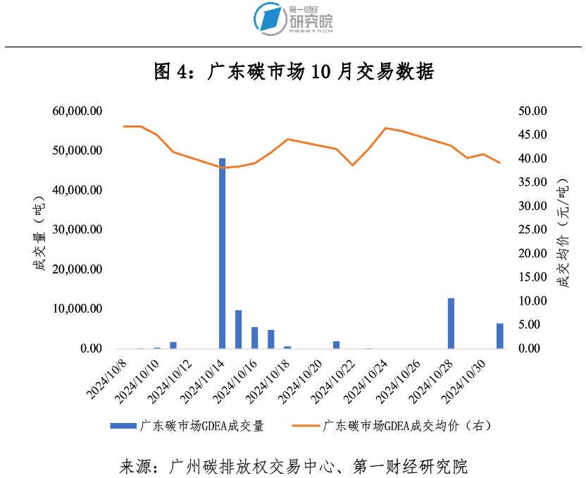 10月廣東碳市場(chǎng)碳排放配額(GDEA)成交量9.27萬(wàn)噸,成交額364.98萬(wàn)元。期間,最高價(jià)50.96元/噸,最低價(jià)34.51元/噸,成交均價(jià)39.38元/噸。10月最后一個(gè)交易日收盤價(jià)39.23元/噸,較9月最后一個(gè)交易日收盤價(jià)43.02元/噸下跌8.81%。截至10月31日,GDEA累計(jì)成交量2.29億噸,累計(jì)成交額66.17億元。