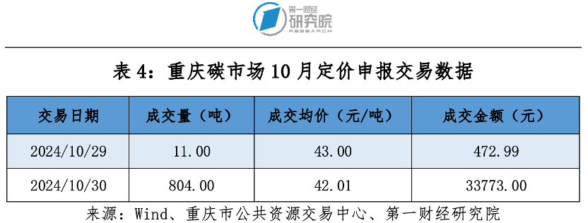 10月重慶碳市場(chǎng)碳排放配額(CQEA)定價(jià)申報(bào)交易成交量815噸,成交金額3.42萬(wàn)元,最高價(jià)43.00元/噸,最低價(jià)42.00元/噸,成交均價(jià)42.02元/噸。10月成交申報(bào)交易成交量10000噸,成交金額40.80萬(wàn)元。