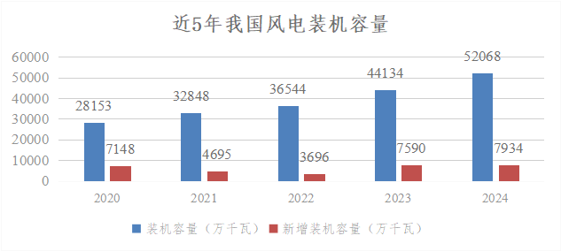 截至2024年末,全國(guó)風(fēng)電累計(jì)并網(wǎng)容量達(dá)到5.21億千瓦,同比增長(zhǎng)18%,其中陸上風(fēng)電4.8億千瓦,海上風(fēng)電4127萬千瓦,在全國(guó)電力裝機(jī)中排在第3位。全年新增裝機(jī)容量7982萬千瓦,同比增長(zhǎng)6%,其中陸上風(fēng)電7579萬千瓦,海上風(fēng)電404萬千瓦。從新增裝機(jī)分布看,“三北”地區(qū)占全國(guó)新增裝機(jī)的75%。2024年,全國(guó)風(fēng)電發(fā)電量9916億千瓦時(shí),同比增長(zhǎng)16%,僅次于火電和水電,排在第3位;全年并網(wǎng)發(fā)電利用小時(shí)數(shù)為2127小時(shí),平均上網(wǎng)利用率95.9%。
